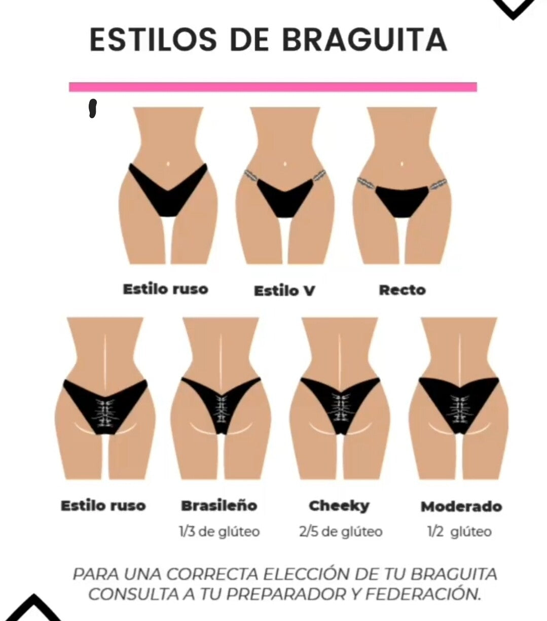 Un diseño sumamente elegante, con toques tornasol que harán un contraste exquisito. Copas clásicas y bragas IFBB (corte ruso).